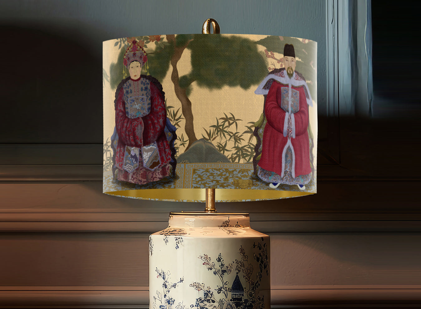 Peacock Garden, Blue, Gold lined lamp shade, Drum, Pendant Lighting