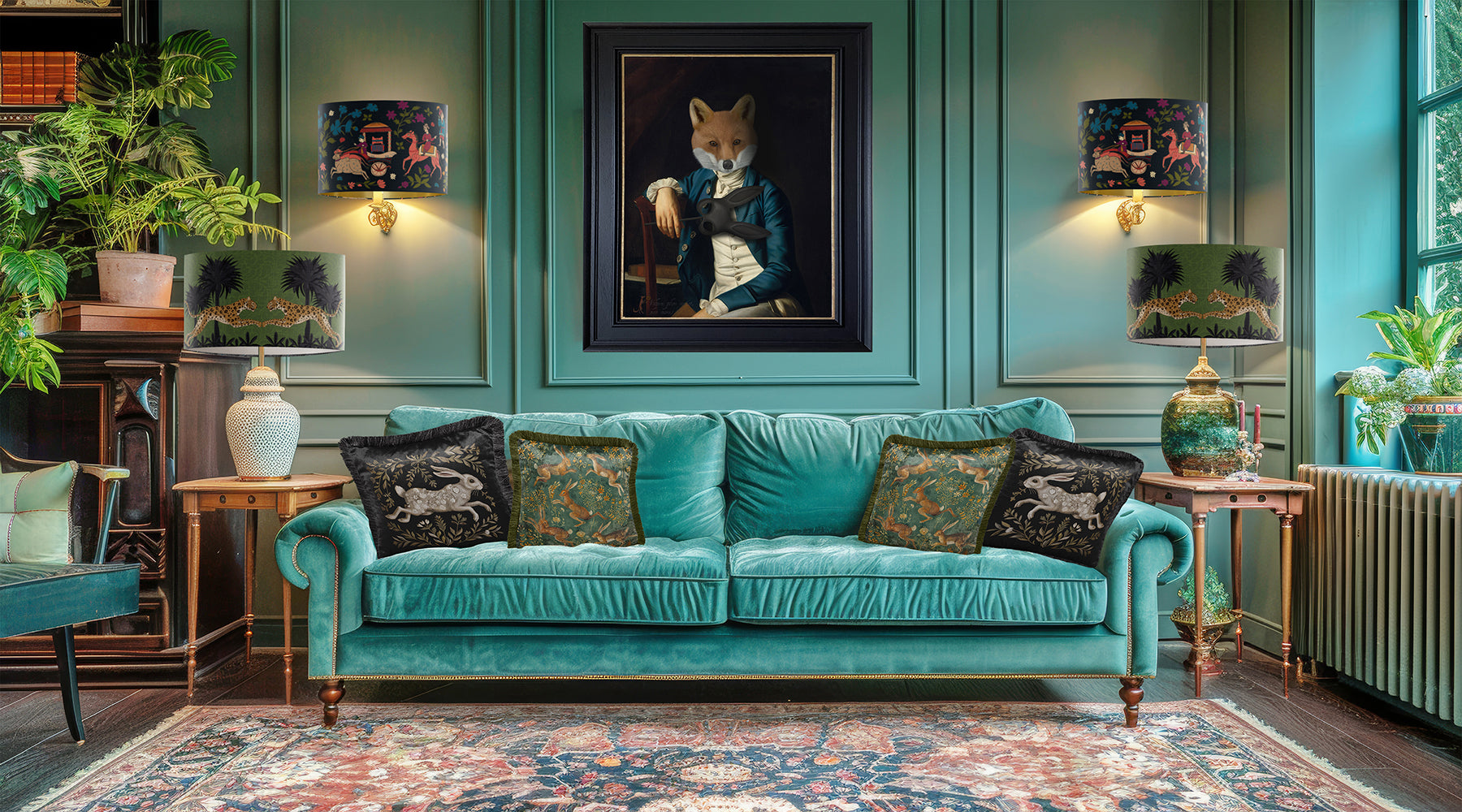 Working from her studio in rural Devon, British artist Kelly Stevens-McLaughlan creates bold, narrative-led artwork inspired by animals, folklore, and storied interiors. Her paintings blend craftsmanship with colour and a quietly eccentric spirit — made for people who prefer their walls with character.