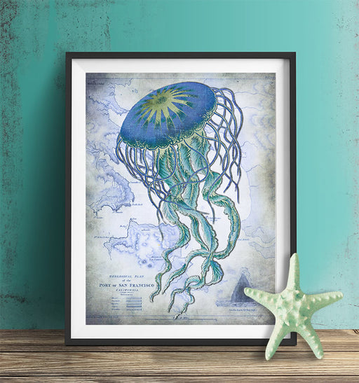 Jellyfish On image of Nautical Map, Nautical print, Coastal art