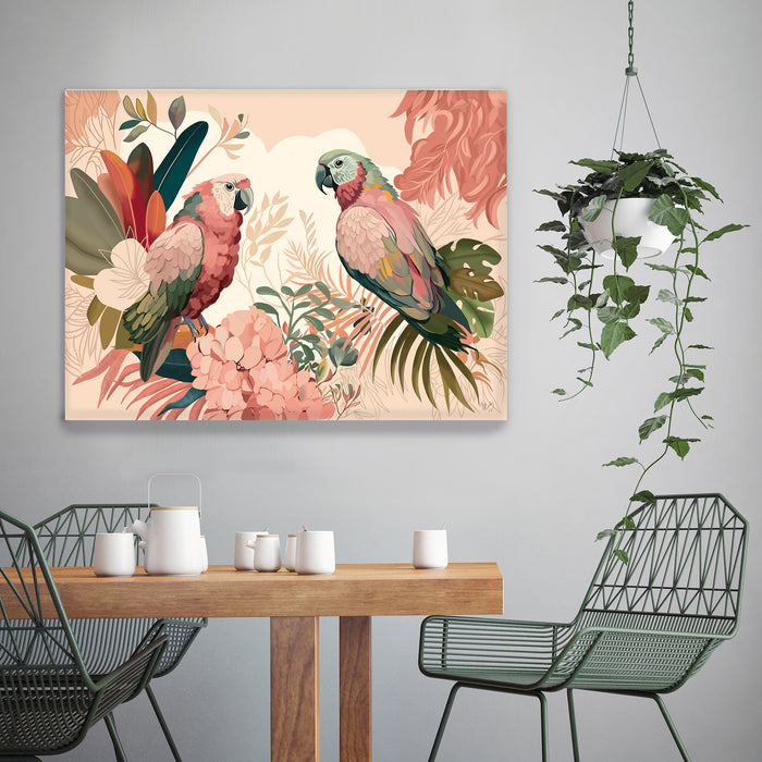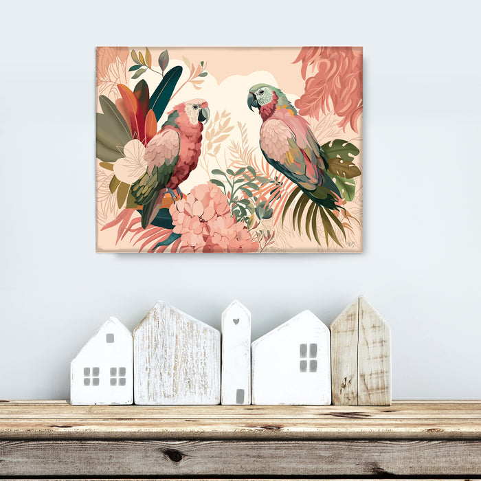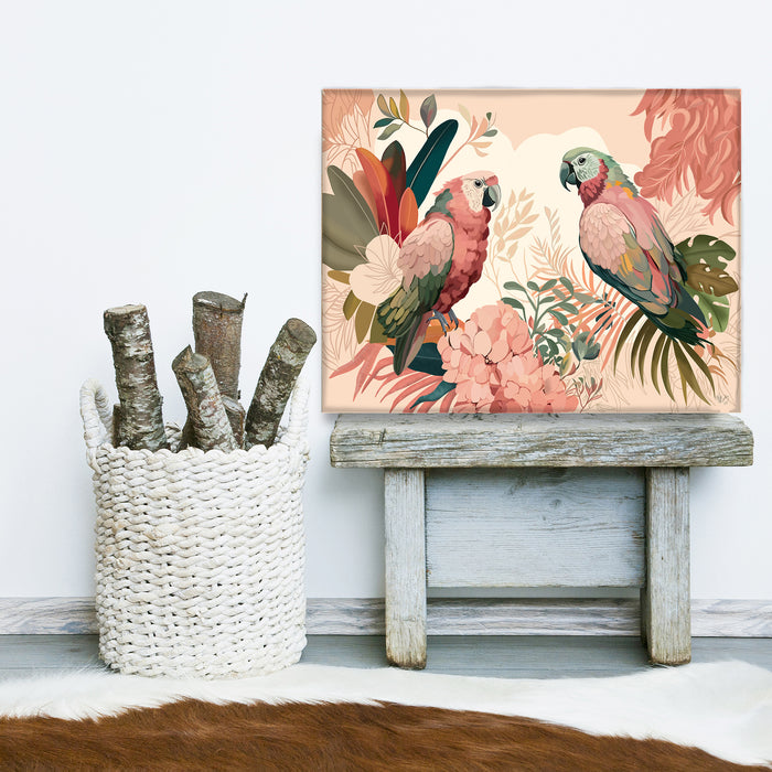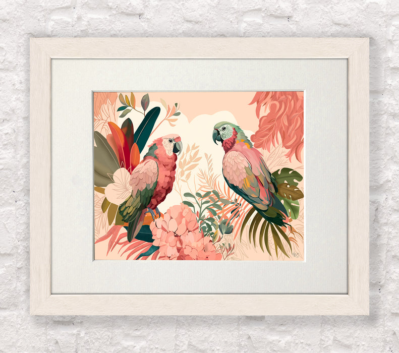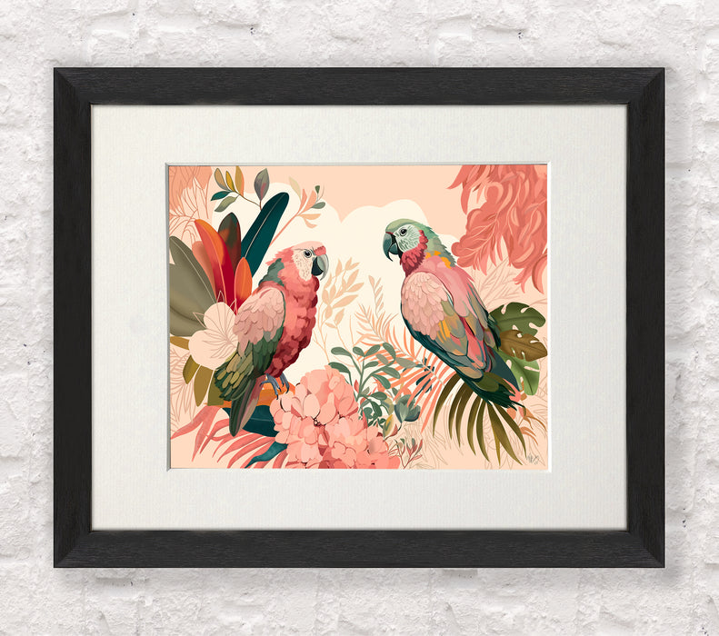 Brimming with modern abstract tropical chic, this bold and colourful art print featuring a pair of lovely parrots will instantly add a jungle trend to any room. Part of our Bright Tropics Collection.