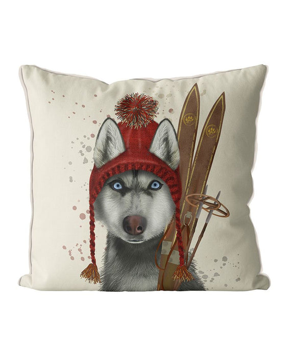 Husky ready for a day out on his skis. If you can bear to part with him, this accent pillow is the perfect dog lover gift or housewarming gift.