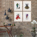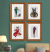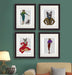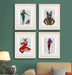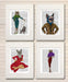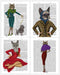 This set of four prints is tailor-made for the devoted cat enthusiast. Featuring a sophisticated cat in a skirt suit strolling with a poised poodle, a cool cat donning a leopard print jacket and sunglasses, a grey beauty in a red dress cradling a white rose, and a seductive feline donning a sleek ensemble, teasingly peering over a purple fan.