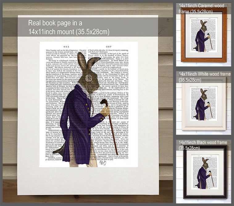 Antique book page in 14x11inch black, white or caramel wood frame (35.5x28cm)