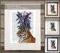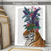 Bright and funky tiger wearing a botanical head dress full of tropical flowers.