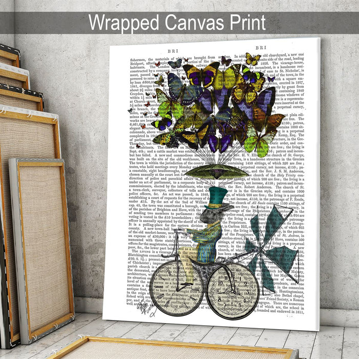 Fantasy painting of a rabbit on a bicycle with a flight of colourful butterflies.