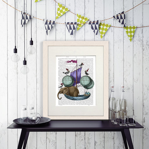 Elephant in Airship with Owls & Birds, Book Print, Art Print, Wall Art