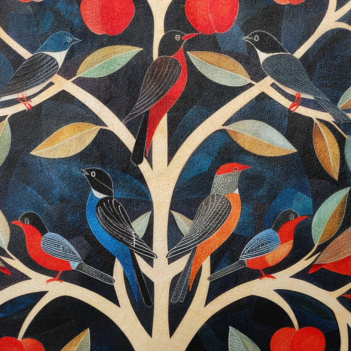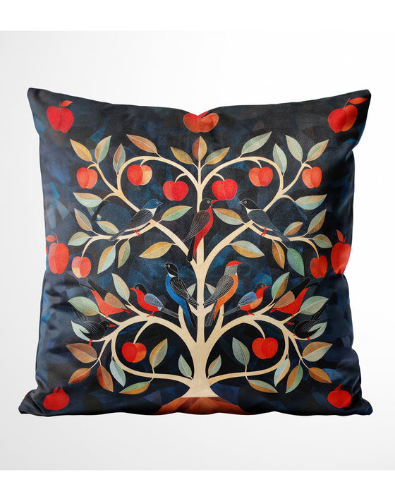 Introducing Braeburn, a stunning cushion inspired by the beauty of a flourishing apple tree. This captivating design features a symphony of birds perched amongst vivid red apples and lush foliage, set against a dramatic dark background. With its rich colors and intricate details, Braeburn brings nature, charm and timeless elegance into your home. Perfect for adding warmth and sophistication to cottagecore, rustic, or modern interiors, this cushion is a true statement piece.