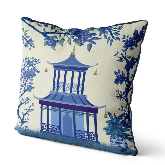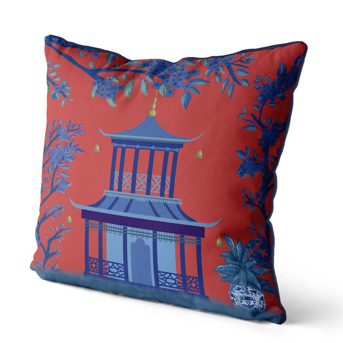 A fabulous Chinese style pagoda graces this beautiful chinoiserie style cushion.