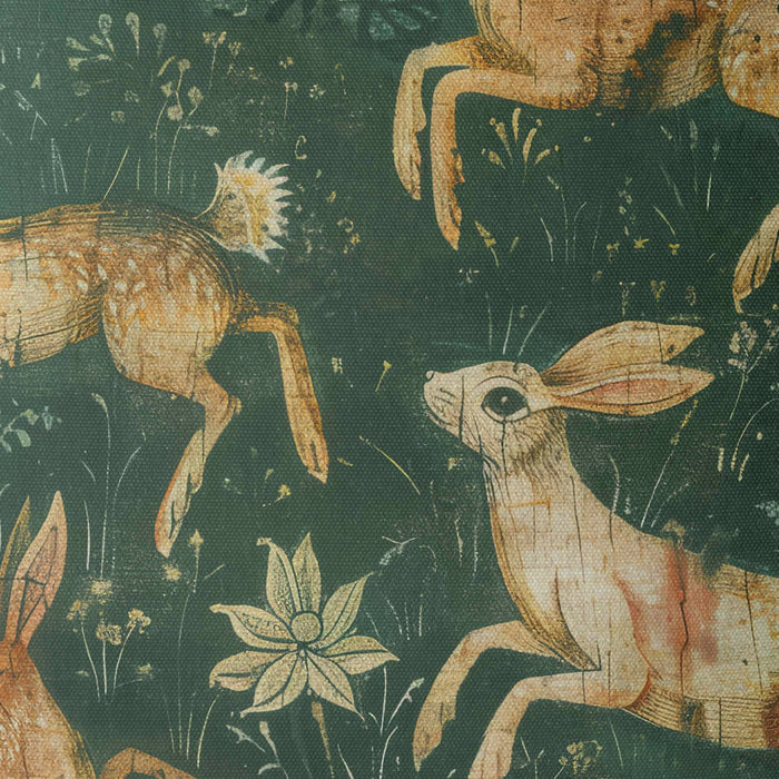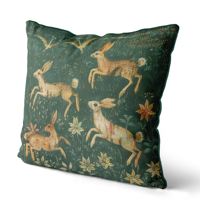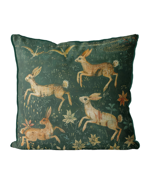 Bring the charm of the countryside into your home with this delightful cushion featuring playful woodland hares frolicking among wildflowers. Inspired by medieval artistry and nature’s beauty, the intricate design and deep green tones make it a perfect statement piece for cottagecore, rustic, or nature-inspired interiors. A whimsical addition that adds warmth, character, and timeless elegance to any space.