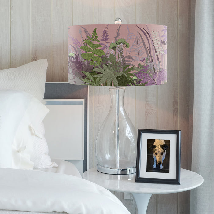 Indulge in botanical chic with 'Hedgerow Blush,' the lampshade that elevates your space to the forefront of contemporary style. Delicate grasses and ferns, artfully illustrated in shades of pink and green, sway atop a serene blush pink canvas. This design seamlessly merges nature's elegance with modern aesthetics, offering a trendy focal point for any room. Also available in a blue and green version.