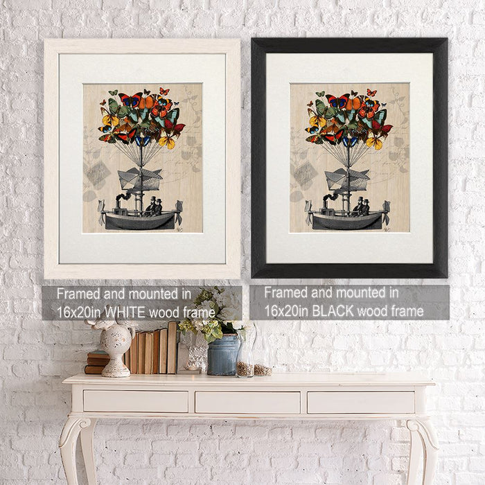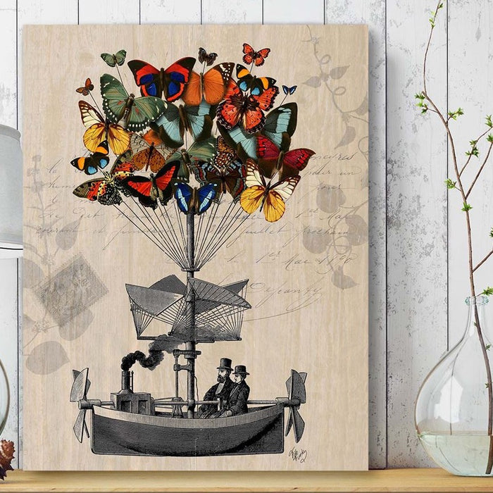 A cloud of beautiful butterflies carrying Victorian Gentlemen in their airship.