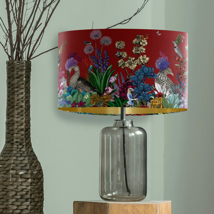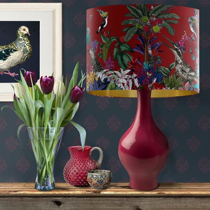An exquisite treasure, this dazzling lampshade will make a statement in any interior space, and truly is a piece of decorative art. From our Glorious Plumes Collection, the design features fabulously plumed birds set amongst a colourful botanical scene. But look more closely and you will find that many other fantastical creatures inhabit this realm, hidden away in between the brightly coloured flowers and leaves.