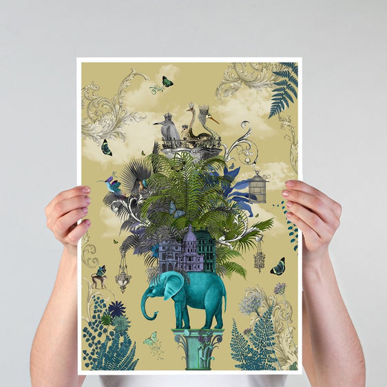 A turquoise elephant balances on an intricate plinth while carrying a micro-world on his back. This beautiful image features fantasy birds,winged monkeys and is intricately detailed.