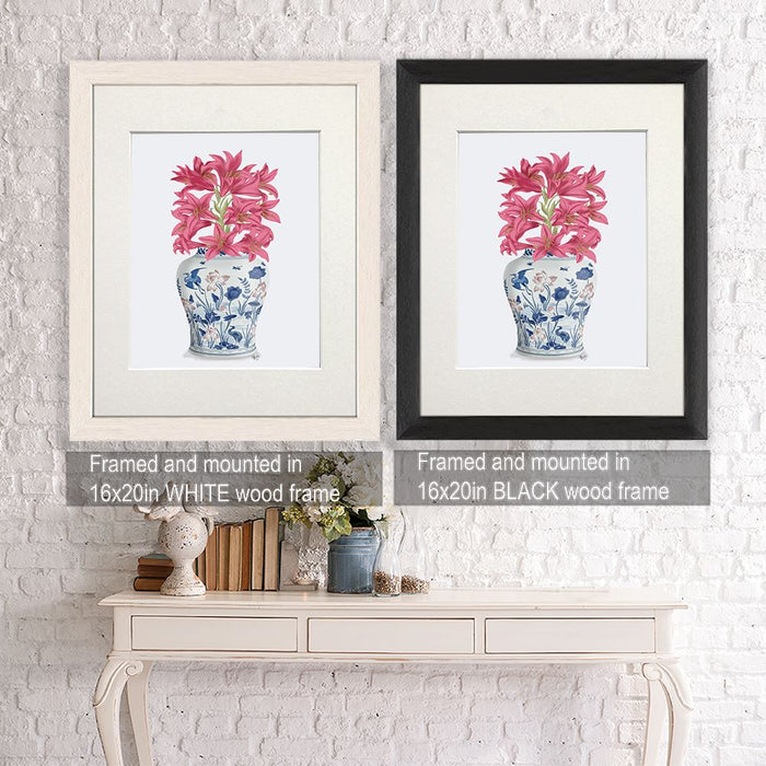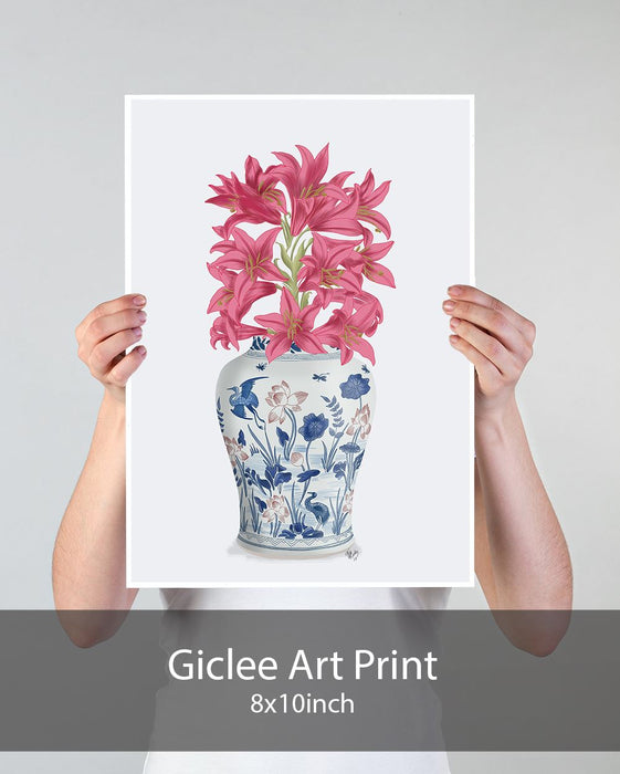 Chinoiserie Lilies Pink, Blue Vase, Art Print