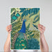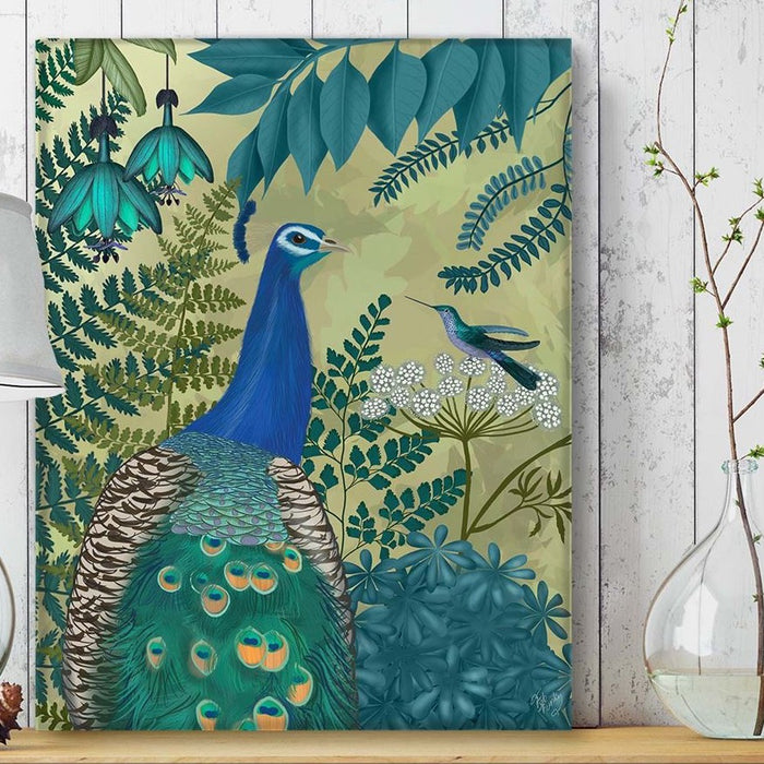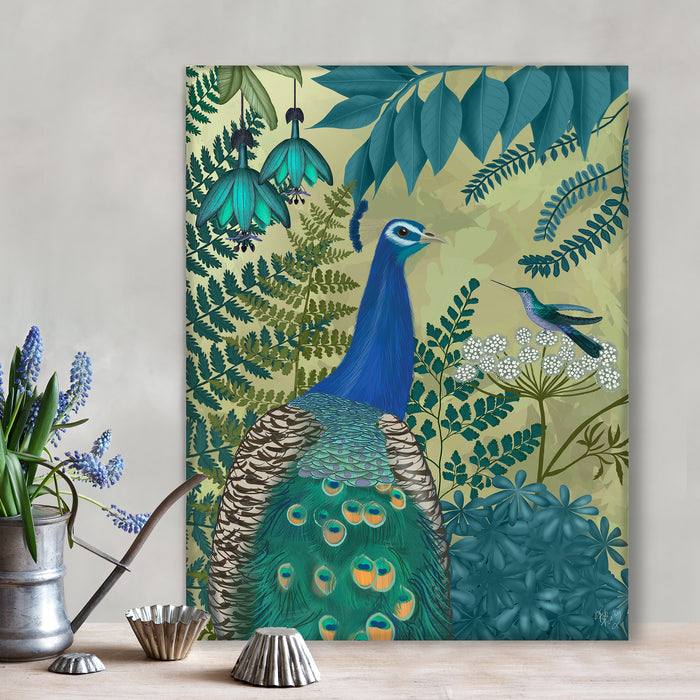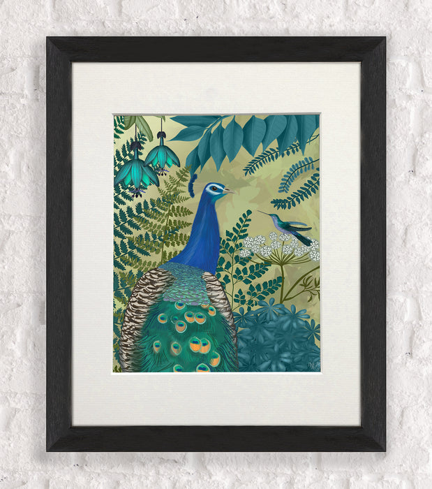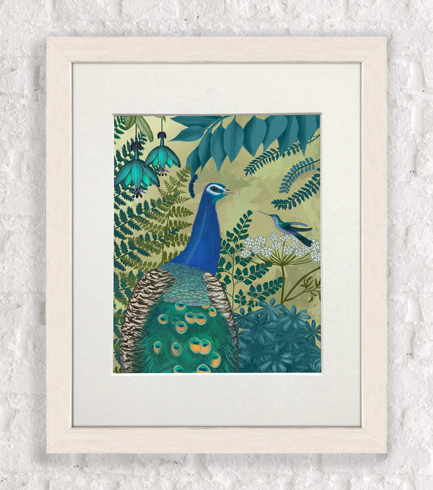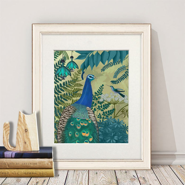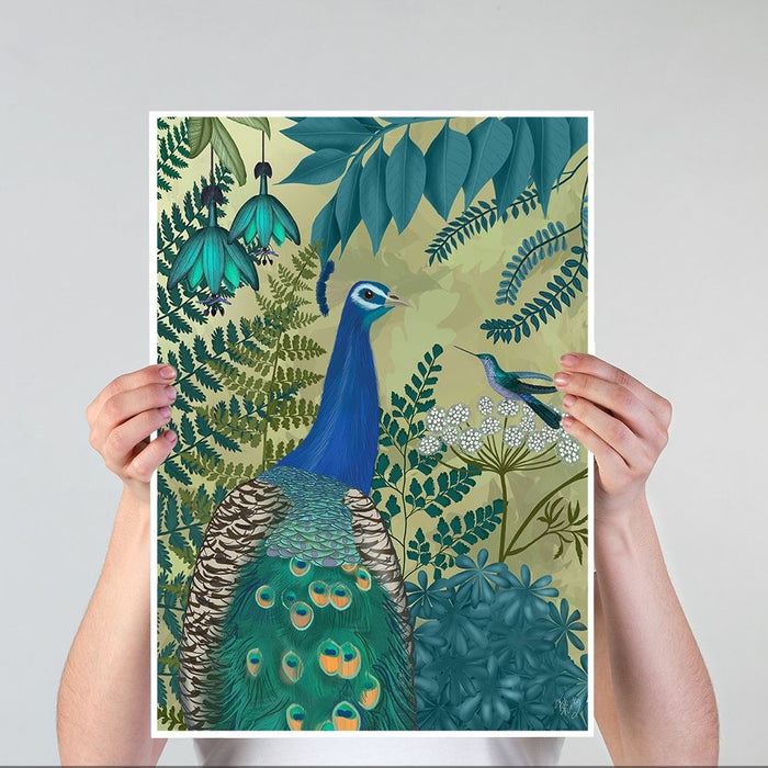 Exotic print of a beautiful vibrant peacock in a botanical setting. From our peacock garden collection, cushions also available.