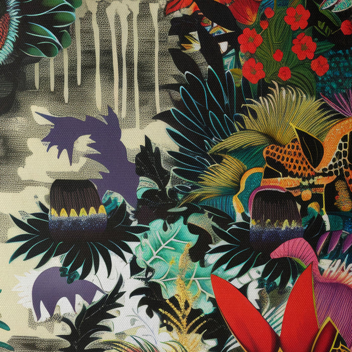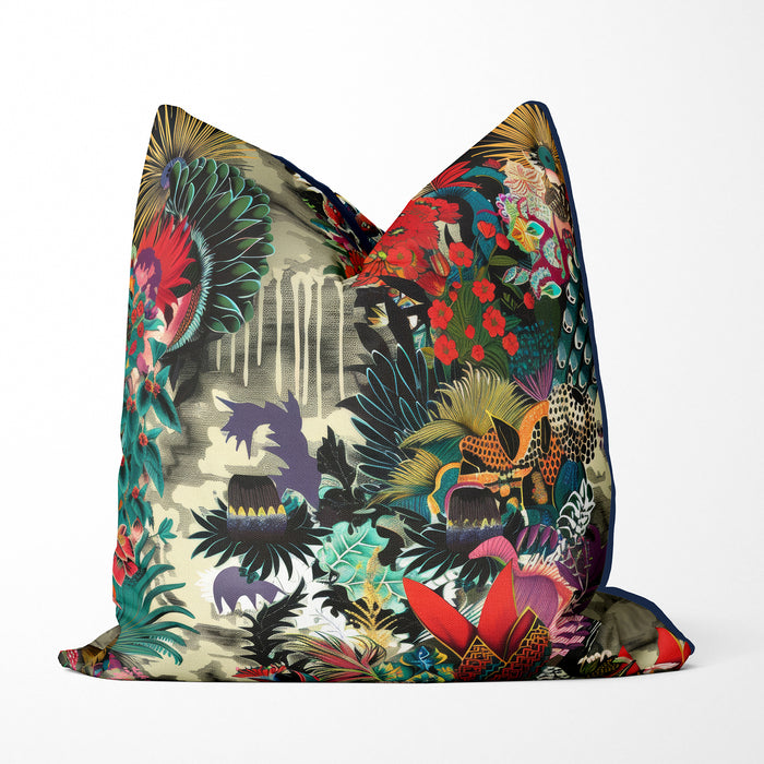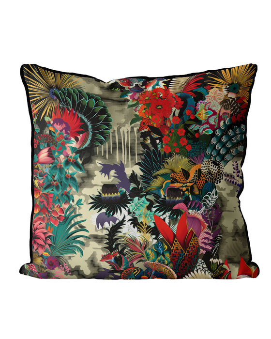This exotic cushion from the Luxe Blossom Atelier collection features a bold and intricate design, blending lush tropical foliage with vibrant floral elements. The rich, jungle-inspired motif showcases a dynamic mix of deep greens, reds, purples, and blues, all set against a textured, neutral backdrop that enhances the vibrancy of the patterns. Available in both indoor and outdoor water-resistant fabrics, this cushion brings a sense of adventure and vibrant energy to any setting. The sophisticated black bias piping adds a refined touch, making this cushion perfect for adding a statement to contemporary or eclectic interiors.