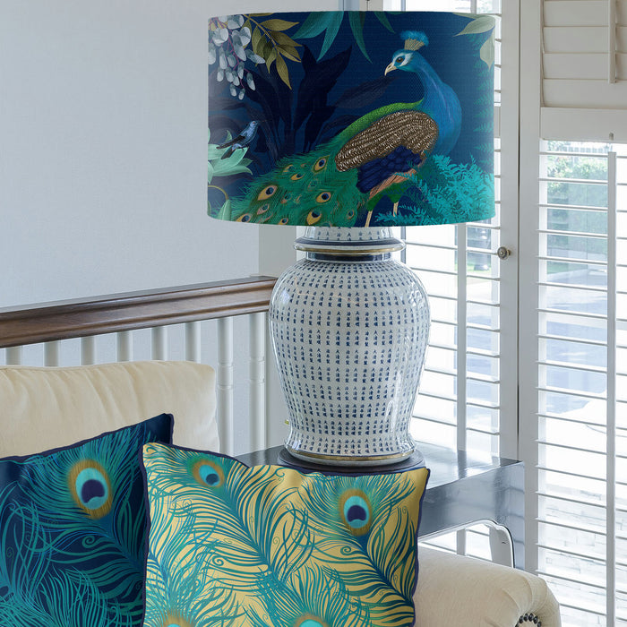 Part of our Peacock Garden Collection, this beautiful lampshade features elegant peacocks and hummingbirds in a stunning floral setting, on a dark blue background. Also available with a gold background here in our shop