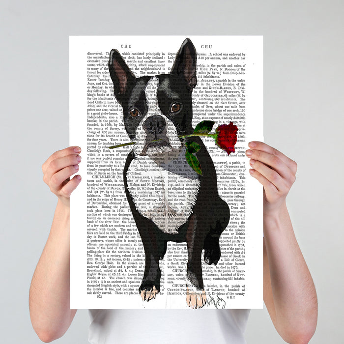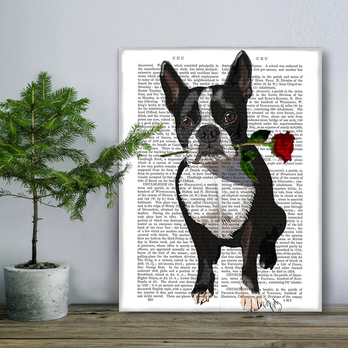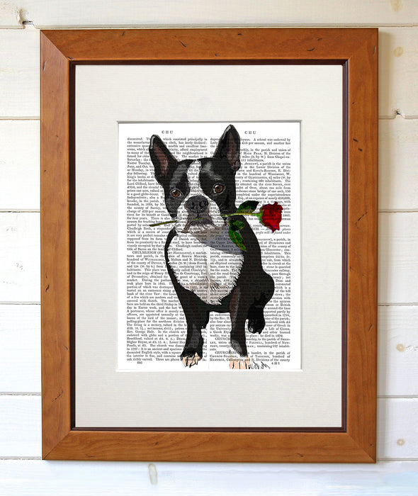 Boston Terrier Rose in Mouth Dog Book Print, Art Print, Wall Art