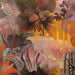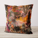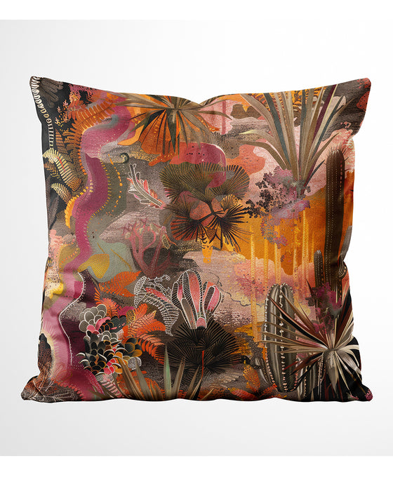 A luxury velvet cushion featuring an abstract design of a cactus desert in warm, vibrant tones of orange and gold, with a touch of pink in a intricate pattern that captures the essence of Southwestern style.