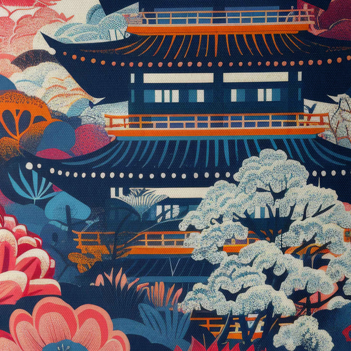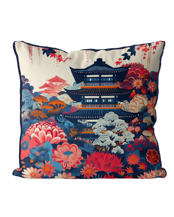 Enhance your space with the rich colours of this beautifully detailed cushion featuring a pagoda nestled in a vibrant landscape of blooming florals and trees, the design is set against a soft cream backdrop. The mix of deep blues, fiery reds, and oranges creates a dynamic yet harmonious palette, making this cushion a perfect way to add a bold yet elegant touch to your decor. Finished with sophisticated bias piping in royal blue, which frames the vibrant print and adds an extra touch of elegance. From our Neo Asian Burst Collection.