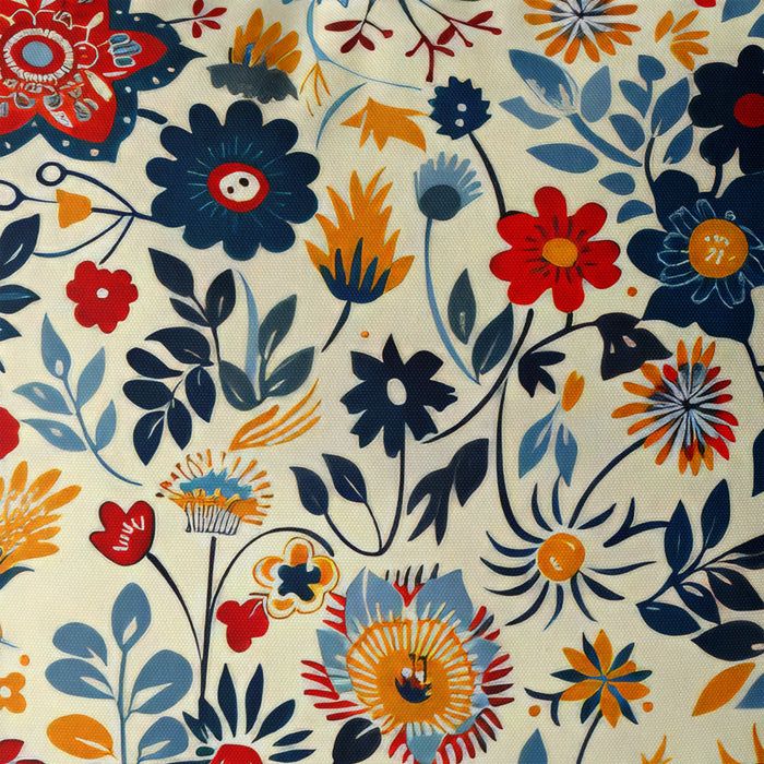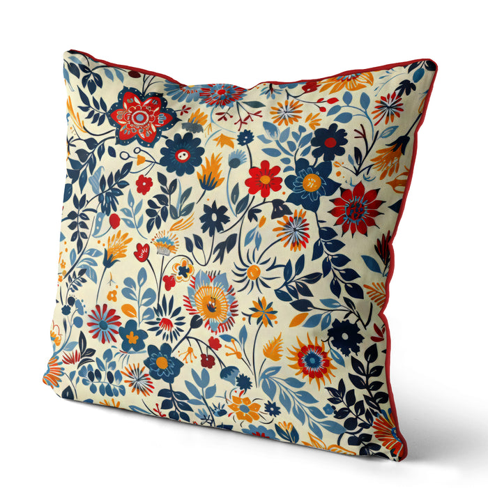 This vibrant floral cushion features a beautifully intricate pattern of flowers and foliage in rich hues of red, blue, and gold against a soft, cream-colored background. Accentuated with elegant scarlet piping along the edges, it brings a touch of timeless charm and bold sophistication to any space. Perfect for adding warmth and character to sofas, chairs, or beds.