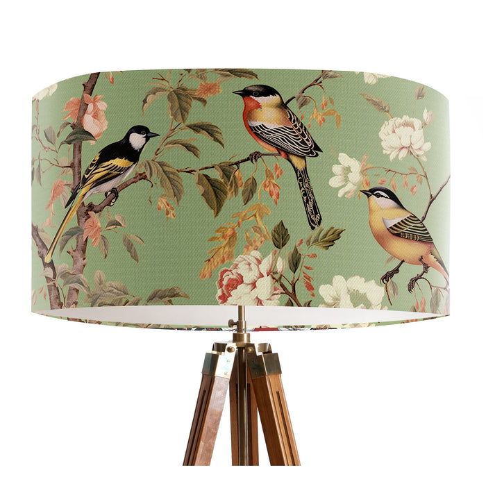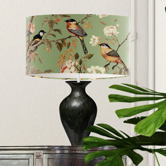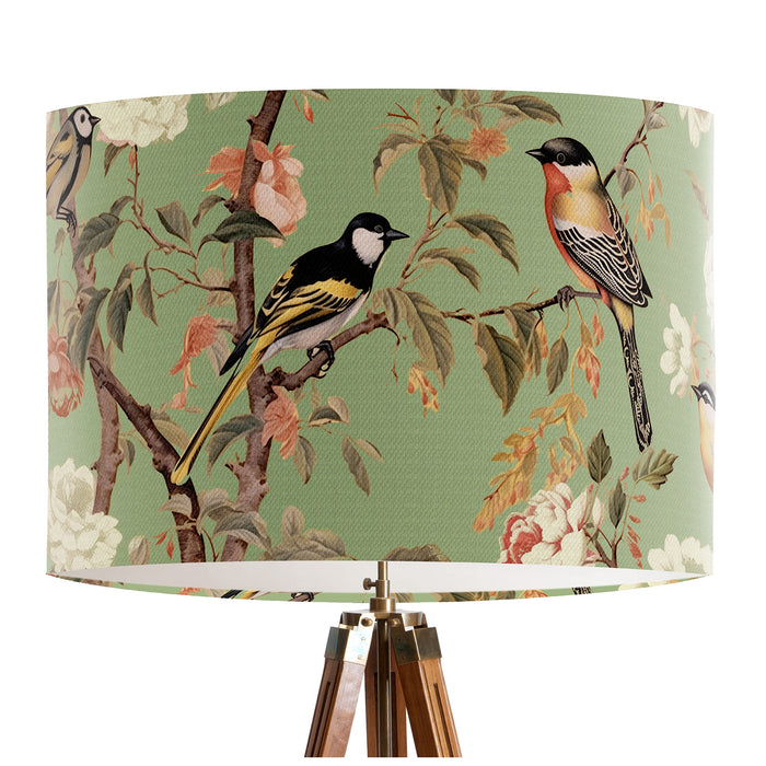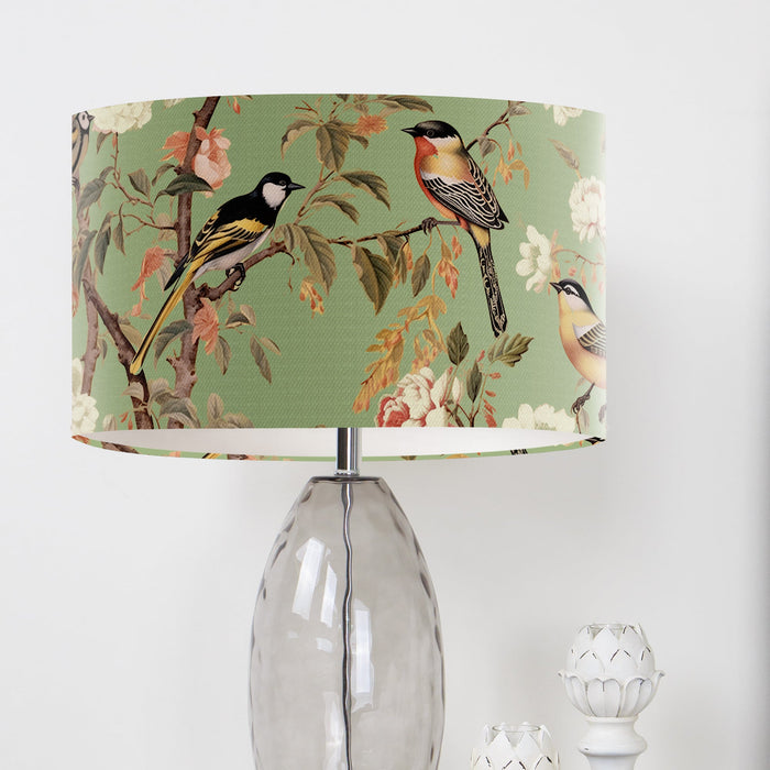 Experience the tranquil beauty of a garden oasis with our Garden Birds Green lampshade. Handcrafted in the UK, this exquisite piece features charming garden birds and delicate blooms against a soft, pale green backdrop. With its serene countryside charm, this printed drum lamp shade adds a touch of natural elegance to any room. Birds perch among branches, while delicate flowers in peach and cream hues create a harmonious scene. Bring the tranquility of a garden into your home with this handmade work of art.