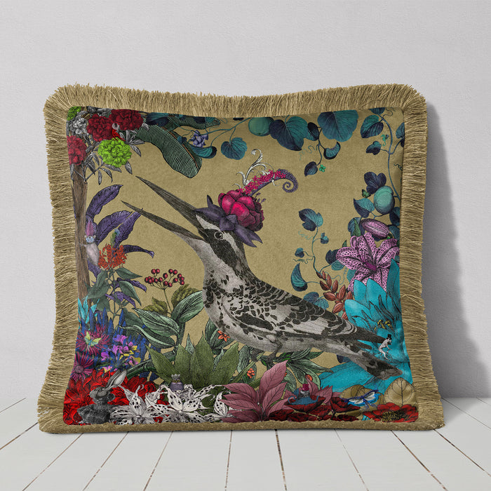 Our Glorious Plumes Cushion Collection comes in six different colour backgrounds and there are six different designs. Here we have our luxury velvet fringed cushions, you will also find this design in our Classic Cotton/Linen range, Our Outdoor Water Resistant range or our lampshade range. So you have a lot to choose from.