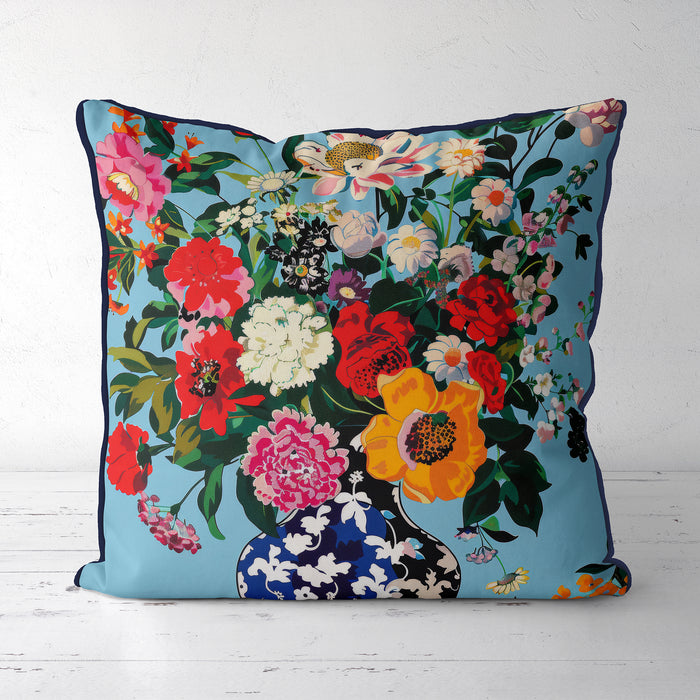 This stunning cushion features a vibrant floral bouquet arranged in an ornate blue and white chinoiserie vase, set against a striking sky-blue background. With rich reds, pinks, yellows, and greens creating a bold and elegant composition, this piece exudes timeless charm and sophistication. Framed with royal blue piping, it’s a perfect accent for adding colour and artistic flair to any interior.