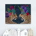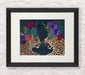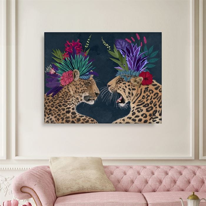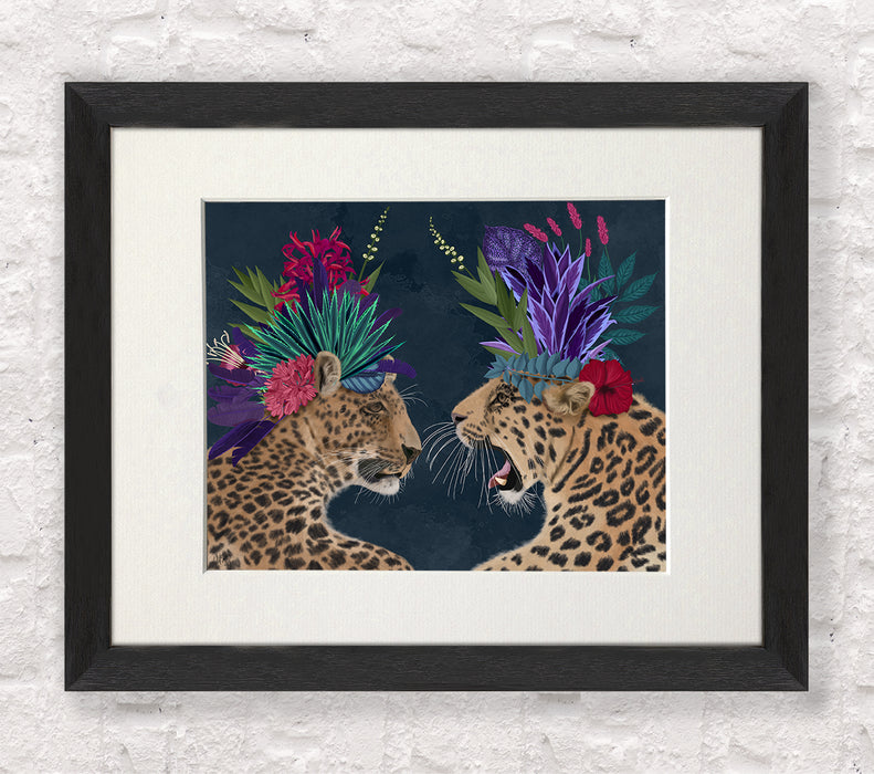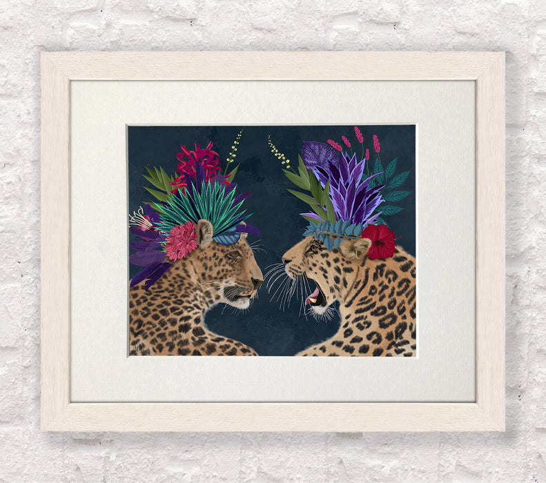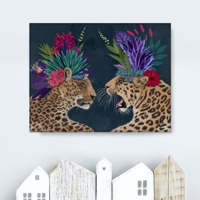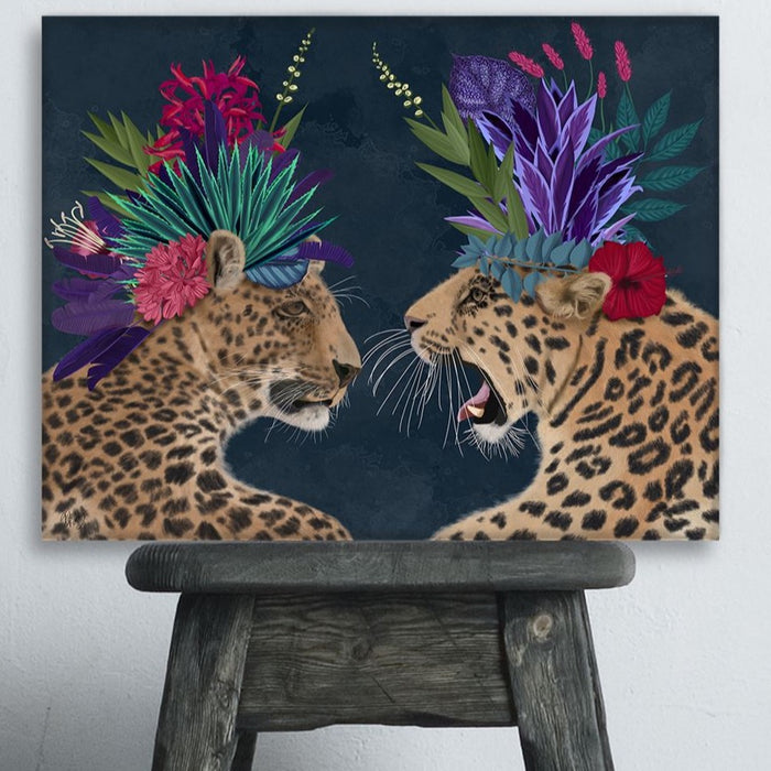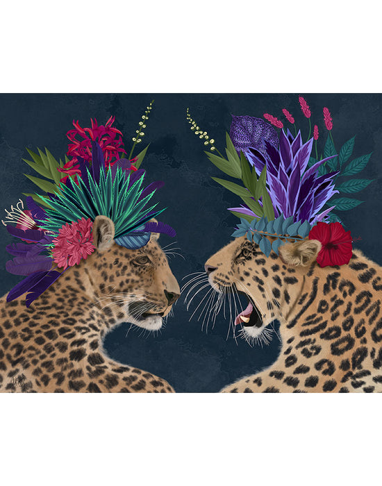 A bright and funky pair of leopards wearing botanical head dresses full of tropical flowers.