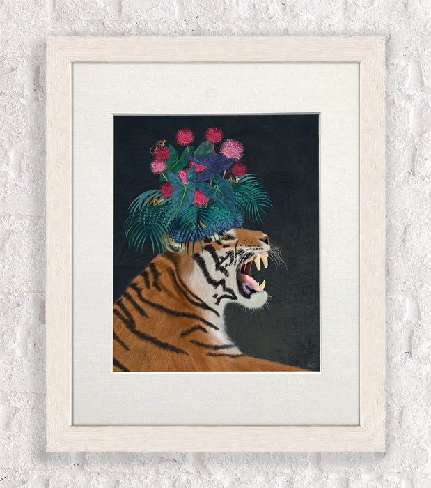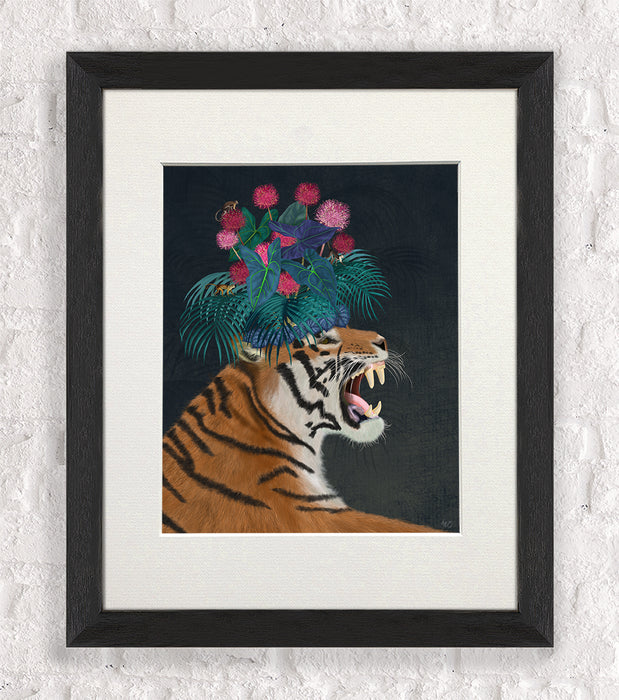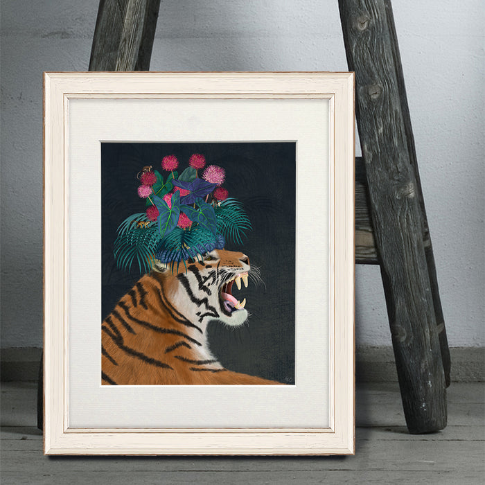 Bright and funky tiger wearing a botanical head dress full of tropical flowers.