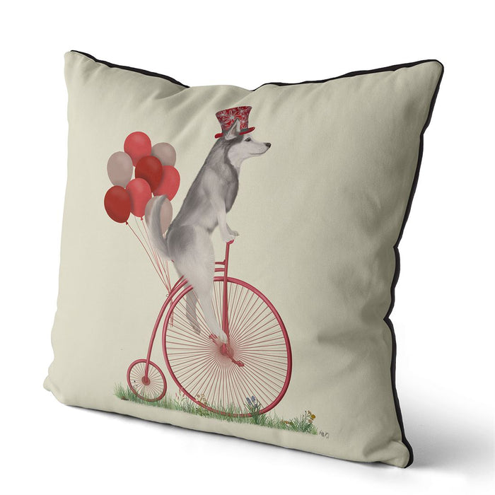 An illustration from our 'Dogs on Penny Farthings' Collection, this adorable cushion cover features a very cute dog riding a brightly coloured Victorian Penny Farthing Bicycle. A definite hit with dog lovers.