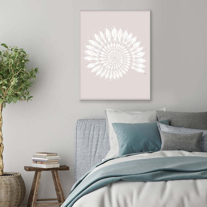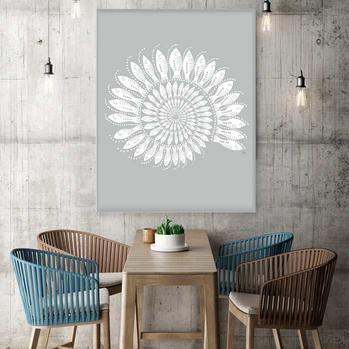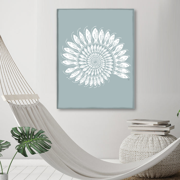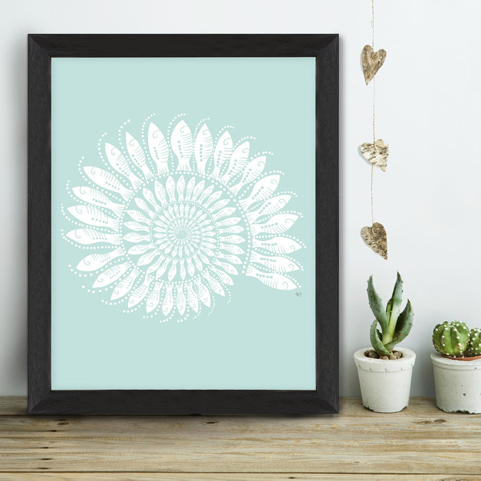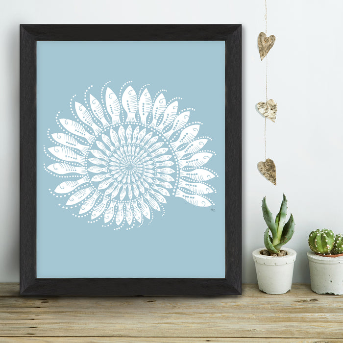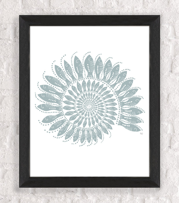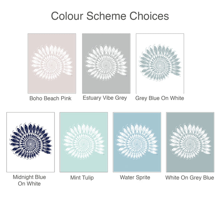 Step into the serene realm of coastal beauty with our Nautilus Shell print, adorned with intricately drawn schools of individually depicted little fishes, offered in a selection of blues & dusty hues to add a subtle yet enchanting touch to your deco