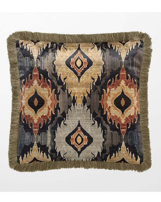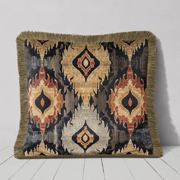 This luxurious velvet cushion features a striking Ikat-inspired design, characterized by bold, symmetrical patterns in earthy tones of gold, beige, black, and rust. Finished with elegant gold/mushroom colour fringes that enhance its sophisticated appeal and provide a refined finishing touch.