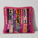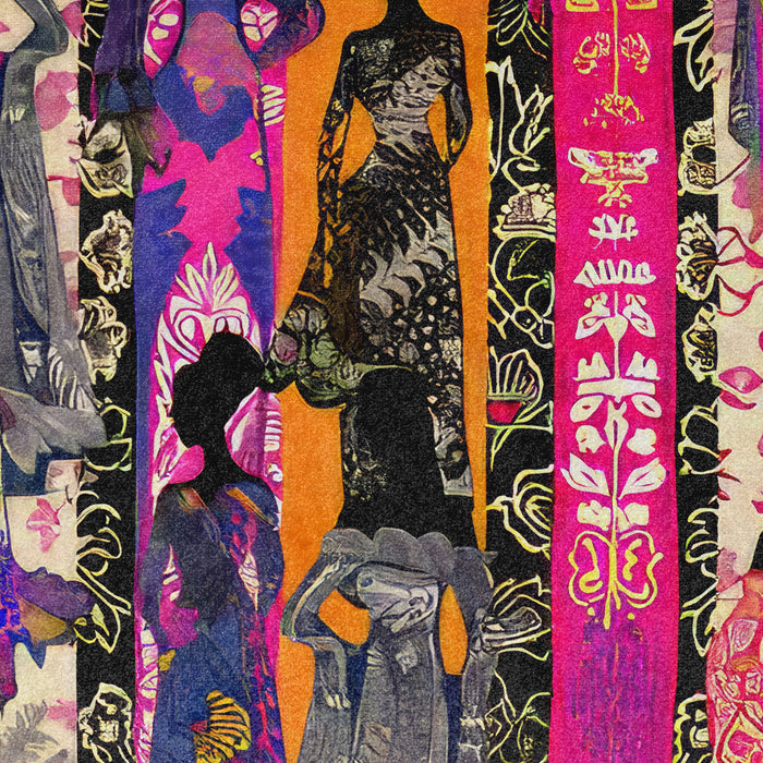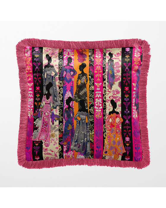 An eclectic bohemian high end designer velvet cushion, pillow cover. Showcasing an array of silhouetted women in various elegant poses, adorned in intricate patterns and vibrant colors with vertical stripes in shades of pink, orange, purple, and black, embellished with floral and geometric motifs, creating a visually striking and dynamic composition.