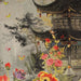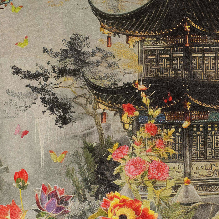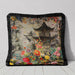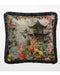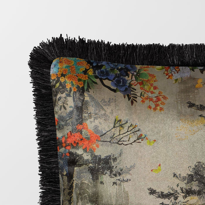 Make a bold statement with this luxurious velvet cushion from the Neo Asian Burst Collection. Featuring a beautifully detailed pagoda surrounded by vibrant florals, the design is set against a soft, muted background that enhances the intricate artwork. The black fringed edge adds a touch of sophistication and drama, perfectly complementing the opulent velvet texture. This cushion is a stunning way to introduce both elegance and a splash of color to your home decor.