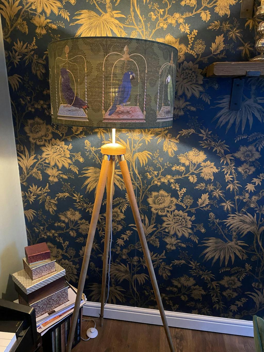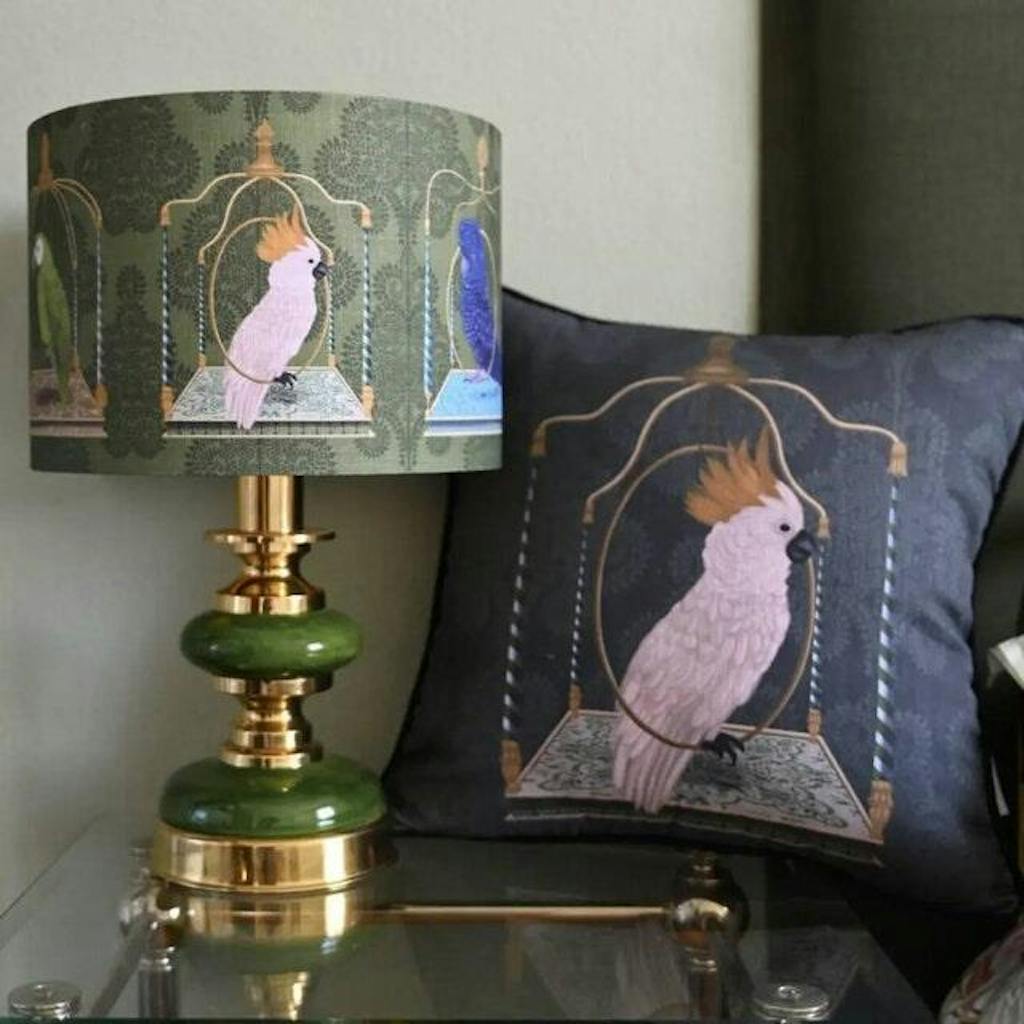 With a highly unusual and beautiful design of an array of parrots sitting on ornamental swings, this lampshade will be a talking point in any room. Also available with gold or charcoal backgrounds.