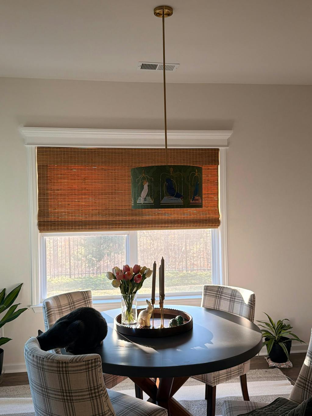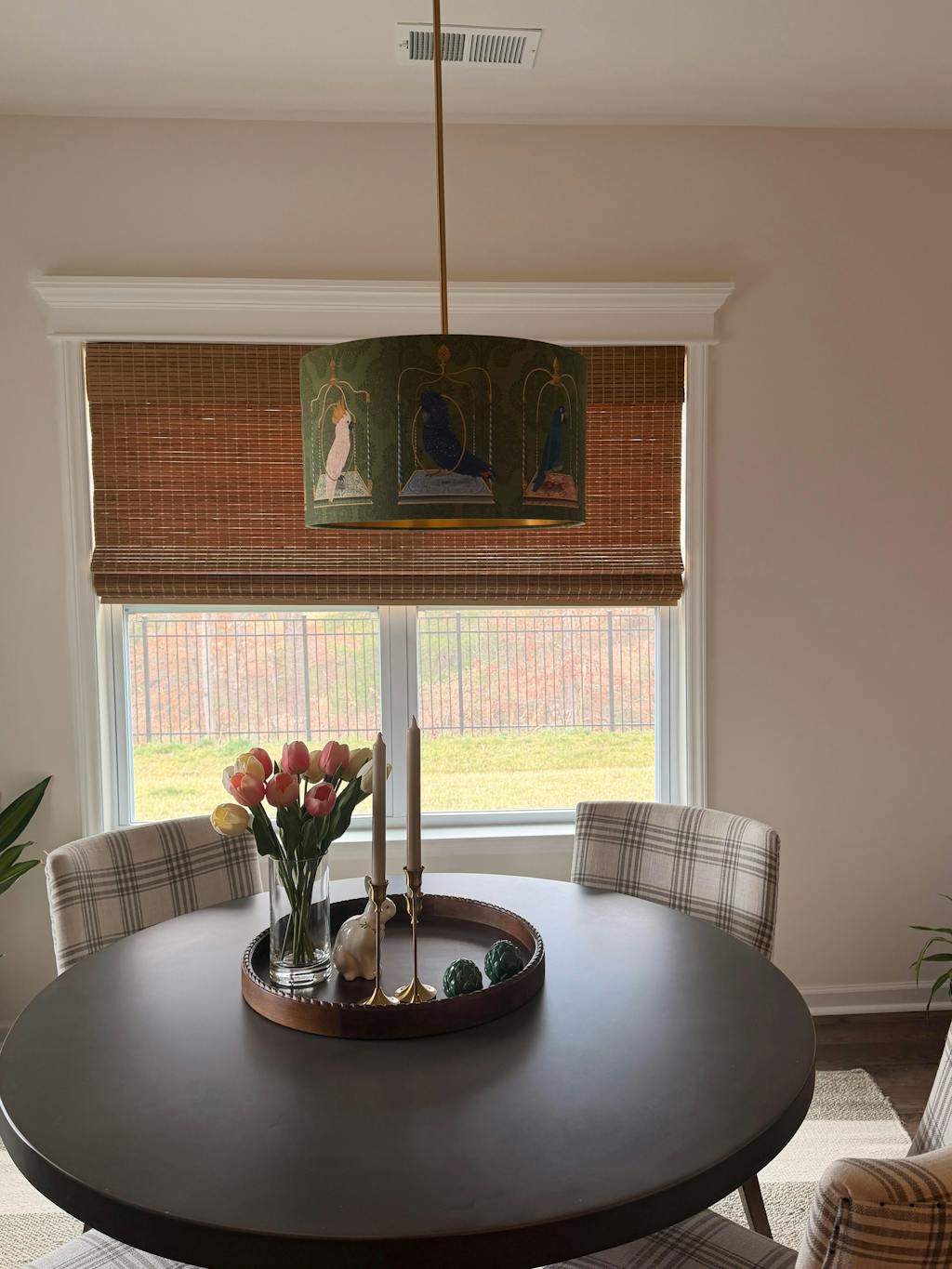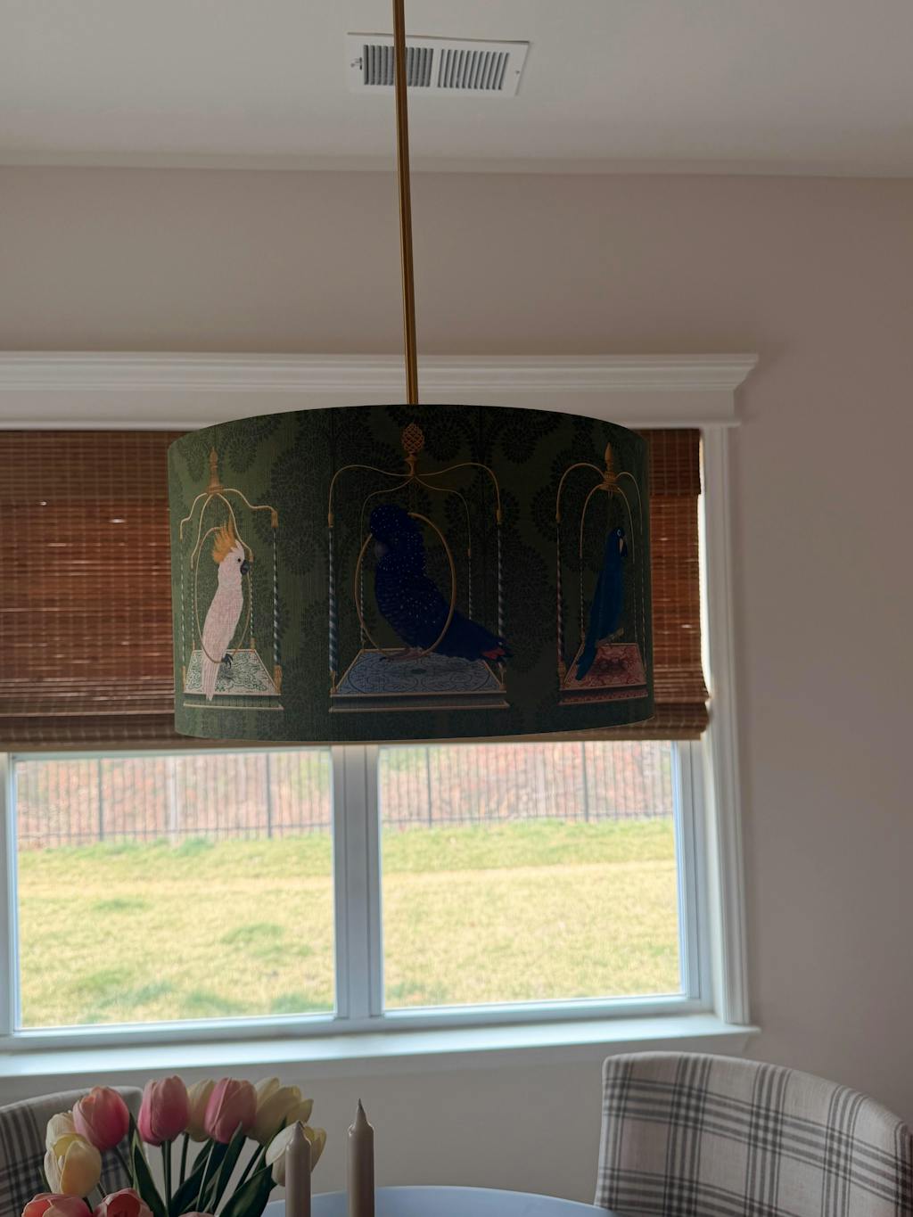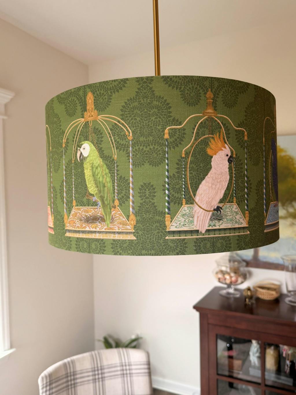 Parrots on swings, Green, Gold lined lamp shade, Drum, Pendant Lighting