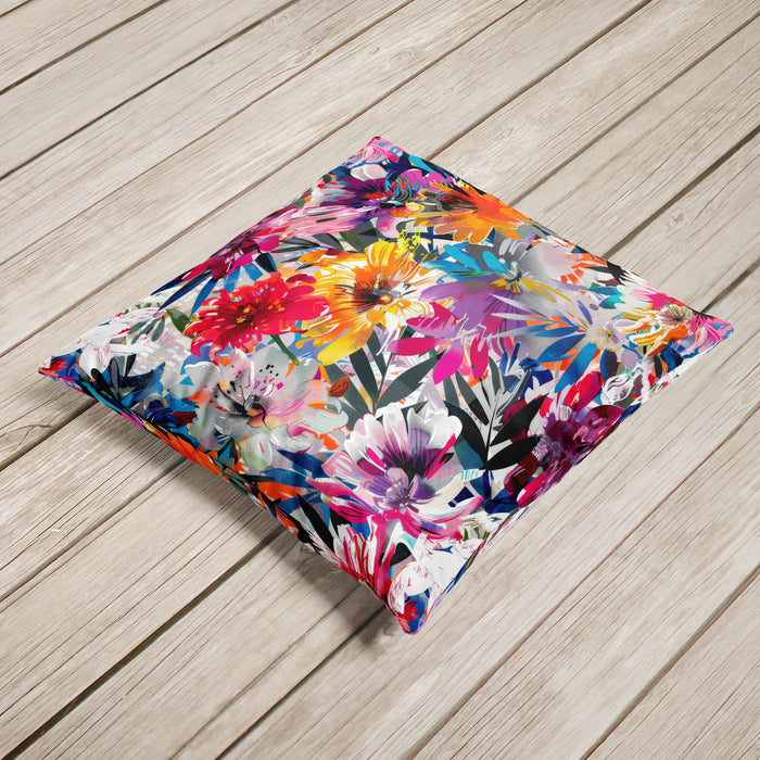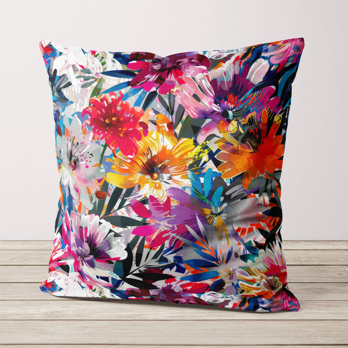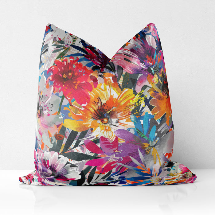 This striking velvet cushion bursts with energy, featuring an explosion of bold, painterly florals in vibrant shades of pink, orange, yellow, purple, and blue. The dynamic brushstroke-style design is layered over a soft abstract background, creating a contemporary and expressive feel. A perfect accent piece to bring a lively, artistic touch to any modern or eclectic interior.