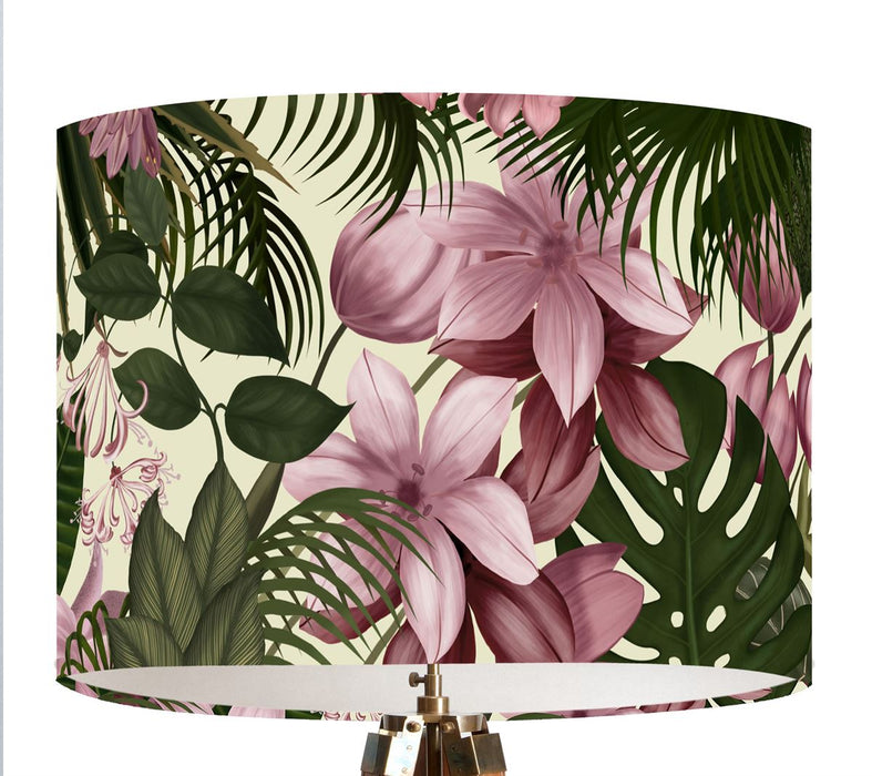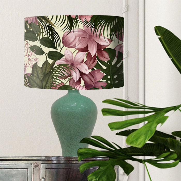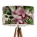 Add some instant glamour to your decor with our beautiful Tropical Blush lampshade. Blush pink flowers entwine with dark green tropical leaves all the way round this shade. Matching cushions available.