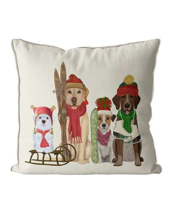Four canine Winter Sports fans. If you can bear to part with it, this accent pillow is the perfect dog lover gift, housewarming gift, or a great gift for anyone who loves winter sports.